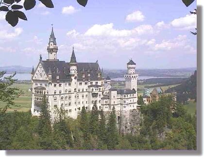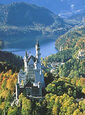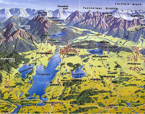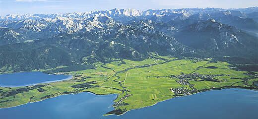 Another view of this beautiful area (from the air), on the left there is the "Bannwaldsee", in the foreground there is the FORGGENSEE (Füssen is more on the right - not in view). The village in the middle is called SCHWANGAU and even from this aerial view NEUSCHWANSTEIN castle can be seen - it is the light spot on the first elevation behind the township of SCHWANGAU.